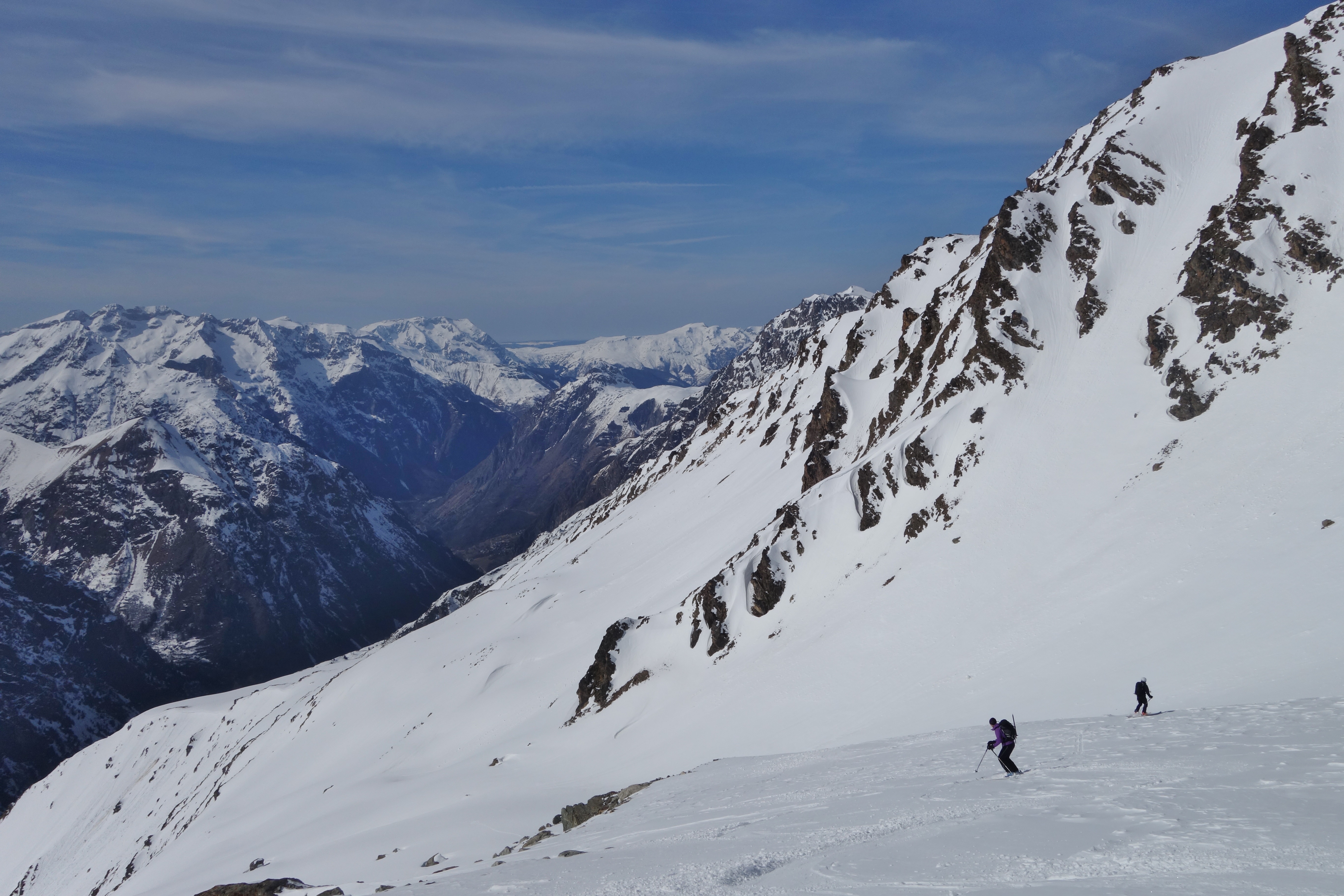 La descente était, au début et jusqu’au Grand Creux, en neige parsemée de vaguelettes dues au vent mais sans que cela gêne pour le ski, puis en neige transformée idéalement dégelée jusqu’à entamer la grande traversée. Ensuite, la neige était un peu plus molle, mais c’était parfait pour que les boules d’avalanche ne gênent pas le ski outre mesure. Nous avons pu emprunter de longues portions épargnées par l’avalanche de toute façon. Après avoir repéré un passage entre les rochers pour rejoindre le grand couloir, il ne restait plus qu’à se laisser glisser jusqu’à la route dans une neige transformée et exempte de boules d’avalanche, et à rejoindre la voiture, ce qui fut fait vers 15h.