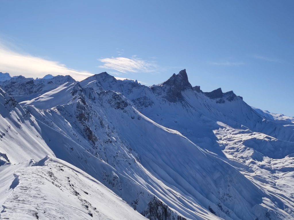Nous sommes partis du village d’Albanne, près des Karellis, par un froid polaire (-14°C au thermomètre de la voiture) non génant au départ grâce au soleil et à l’absence de vent. Nous avons remonté la piste sur la gauche menant au fond du vallon que nous avons remonté, mais cette fois-ci à l’ombre, ce qui a nécessité de remettre nos vêtements chauds! Vers 2150m d’altitude, après avoir retrouvé le soleil, nous avons obliqué progressivement à droite pour finir par remonter l’esthétique arête Est de la Pointe d’Emy. Après un rapide casse-croûte (il ne faisait quand même pas bien chaud…) et quelques photos de ce magnifique paysage, nous sommes redescendus directement du sommet direction Sud-Ouest pour rejoindre le fond du vallon dans une neige poudreuse de rêve (à part, pour être impartial, un ou deux courts passages légèrement croutés). Puis, nous avons traversé le ruisseau enneigé pour descendre une pente peu tracée et en neige bien froide rive droite. Les meilleures choses ayant une fin, vers 1900m, nous avons dû retraverser le ruisseau pour reprendre la piste nous ramenant au village. Après un pot bien mérité au bar du village, nous avons repris les voitures.