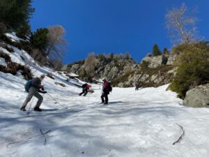 Redescente à pied en contournant le couloir de montée, avec application des techniques aussi (notamment de rappel).