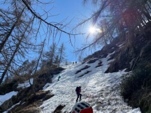 Après-midi : techniques pour s’arrêter avec un piolet lors d’une chute dans une pente. Application par cordée de deux personnes.