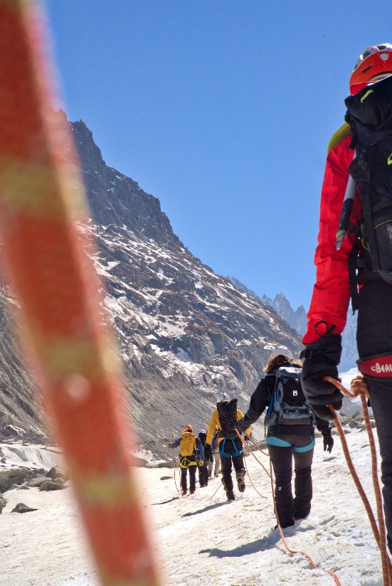 Montée à la mer de glace par le train de Montenvers, marche sur le glacier et découverte des techniques de glace (crampon, piolet) ainsi que des techniques d’amarrages en glace (broche, broche éjectable, champignon de glace).