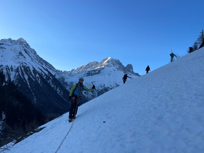 Après-midi : techniques pour s’arrêter avec un piolet lors d’une chute dans une pente. Application par cordée de deux personnes.