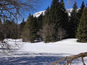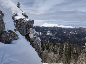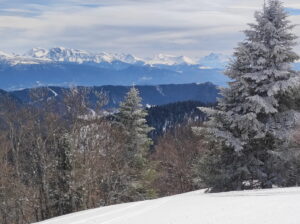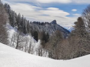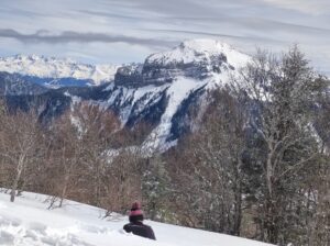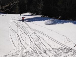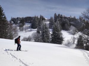 Nous enlevons les peaux et descendons le long de la crête direction Sud, puis remontons à pied une dizaine de mètres jusqu’au Mont Fromage. De là, nous rechaussons et descendons par la crête toujours direction Sud jusqu’au petit collet, d’où nous prenons la combe Est, en neige poudreuse, longeons le ruisseau, et rattrapons le chemin 50m au-dessus du parking et nous laissons glisser jusqu’à lui.