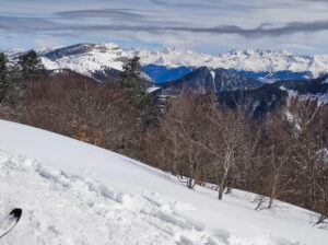 Sous le sommet de la Pinéa, nous plongeons dans les pentes Nord-Ouest du sentier Vermorel : belle descente en neige poudreuse dans les sapins clairsemés ! Nous traversons vers la droite au-dessus des barres rocheuses, et prenons le fond du vallon qui nous mène triomphalement à la prairie de Girieux :