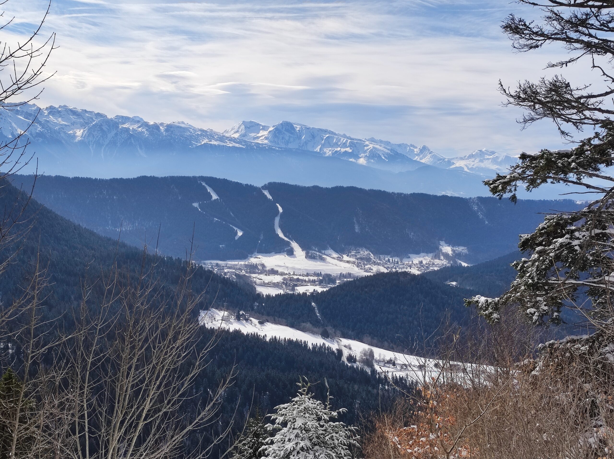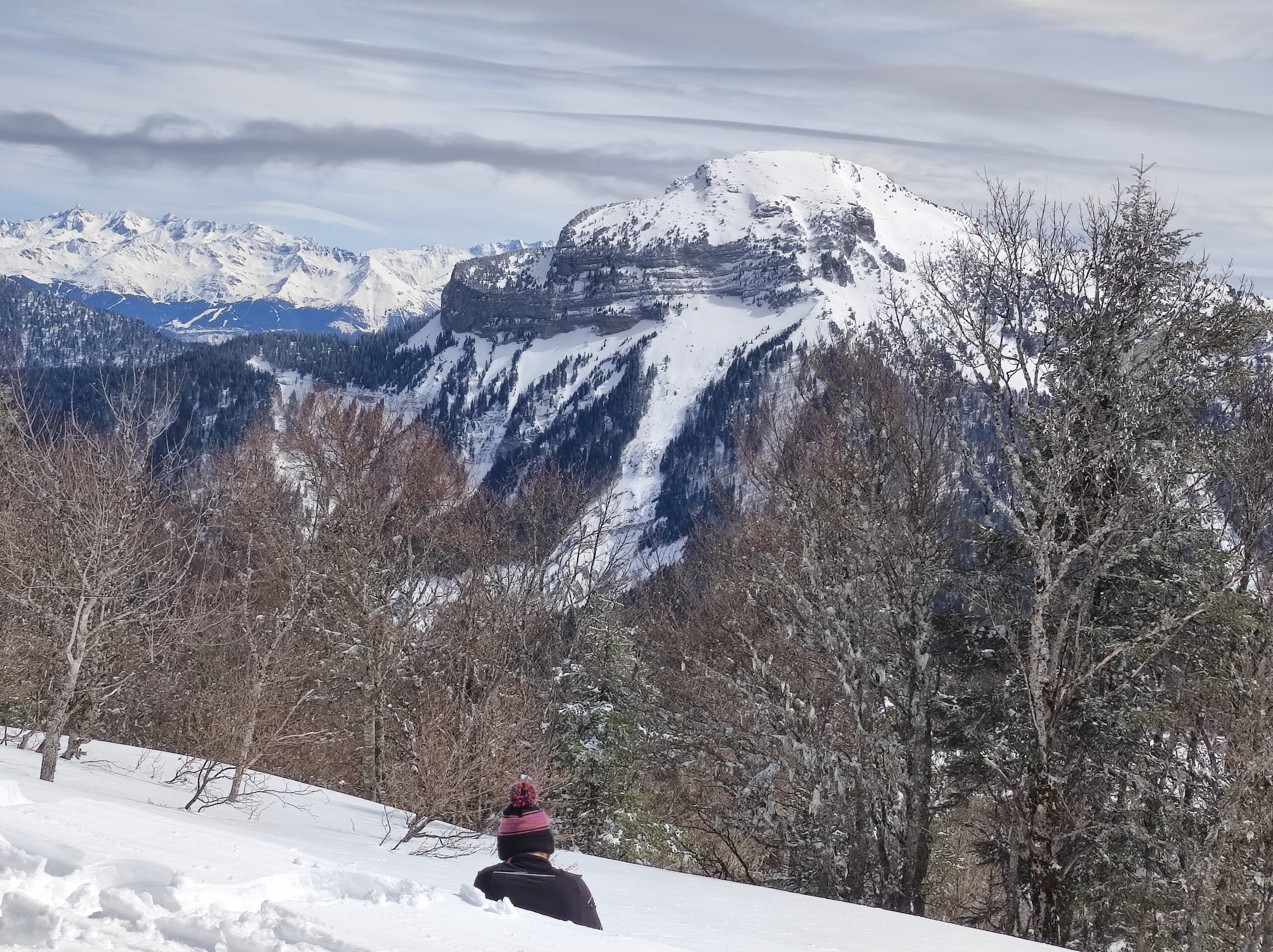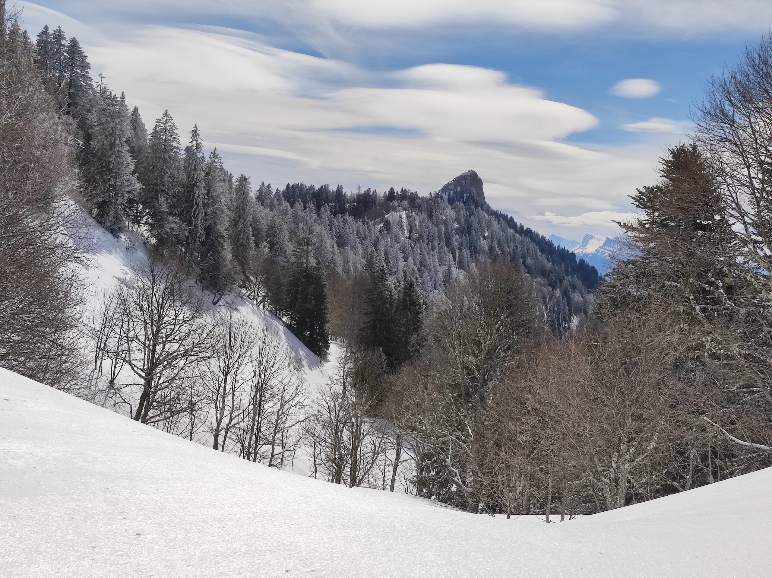 Sous le sommet de la Pinéa, nous plongeons dans les pentes Nord-Ouest du sentier Vermorel : belle descente en neige poudreuse dans les sapins clairsemés ! Nous traversons vers la droite au-dessus des barres rocheuses, et prenons le fond du vallon qui nous mène triomphalement à la prairie de Girieux :