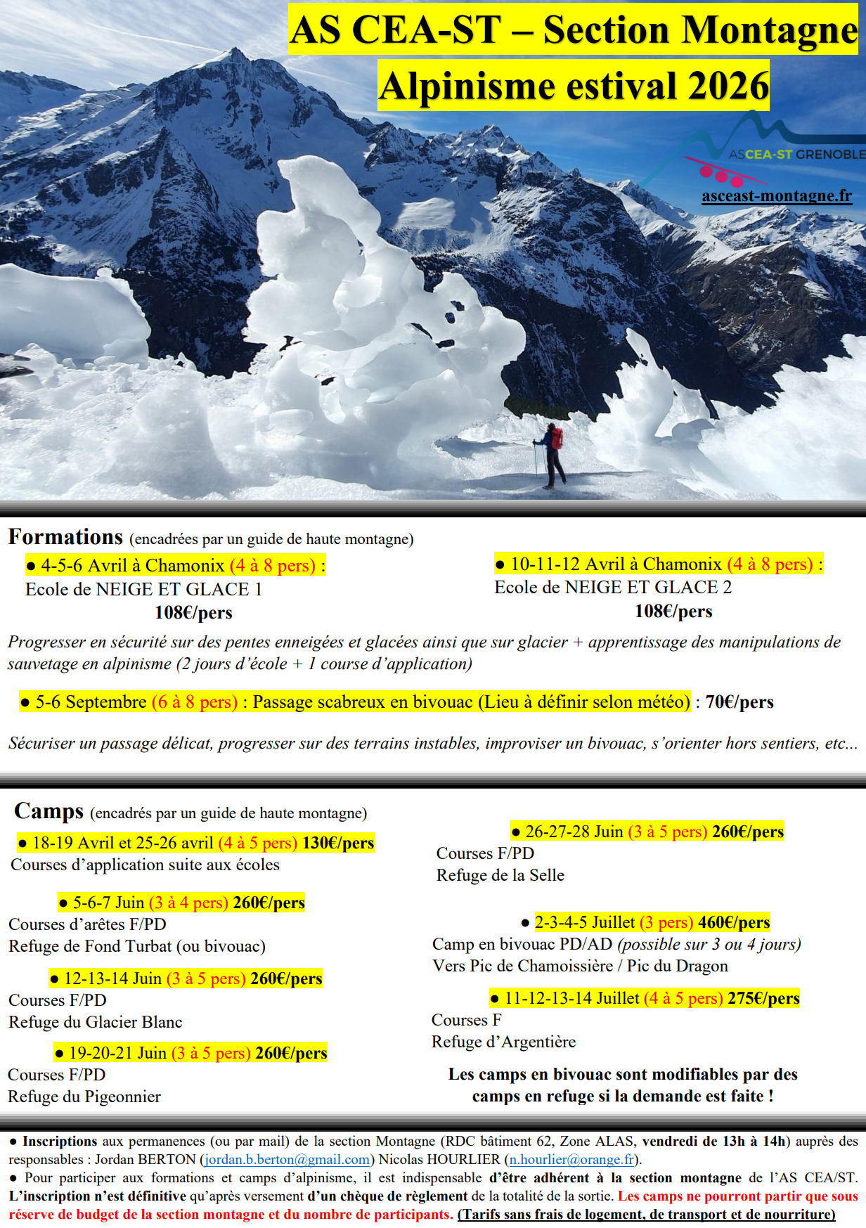 ● Pour participer aux formations et camps d’alpinisme, il est indispensable d’être adhérent à la section montagne de l’AS CEA/ST. L’inscription n’est définitive qu’après règlement de la totalité de la sortie. Les camps ne pourront partir que sous réserve de budget de la section montagne et du nombre de participants. (Tarifs sans frais de logement, de transport et de nourriture)