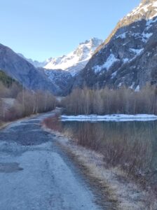 Nous partons du Pont d’Arsine, au-dessus de Villar d’Arêne, skis sur le sac et empruntons une large piste qui serait tout à fait carrossable si elle n’était fermée par une barrière 🙁 .