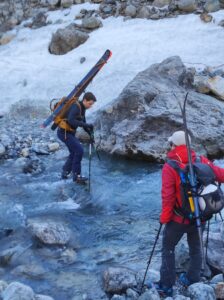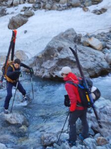 Vers 2100m d’altitude, nous rejoignons l’étroite langue de neige du bas du vallon de l’Homme qui nous permet de redescendre à ski jusqu’à l’altitude de 1760m, soit presque jusqu’en bas du vallon, moyennant un déchaussage de quelques mètres au milieu.
