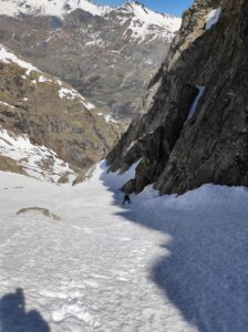 Nous remontons le vallon de l’Homme toujours à pied car ce vallon n’est plus parcouru que par une étroite bande de neige, interrompue par quelques passages rocheux, qui sera fort utile à la descente, mais aurait nécessité de trop nombreuses conversions et déchaussages à la montée. Vers 2100m, nous chaussons enfin les skis et remontons les pentes Nord qui nous amènent à un premier passage raide, étroit, et bien gelé. Nous remontons donc ce couloir en crampons/piolet. Nous franchissons ainsi 3 étroitures séparées par de courtes zones plus larges et un peu moins raides.