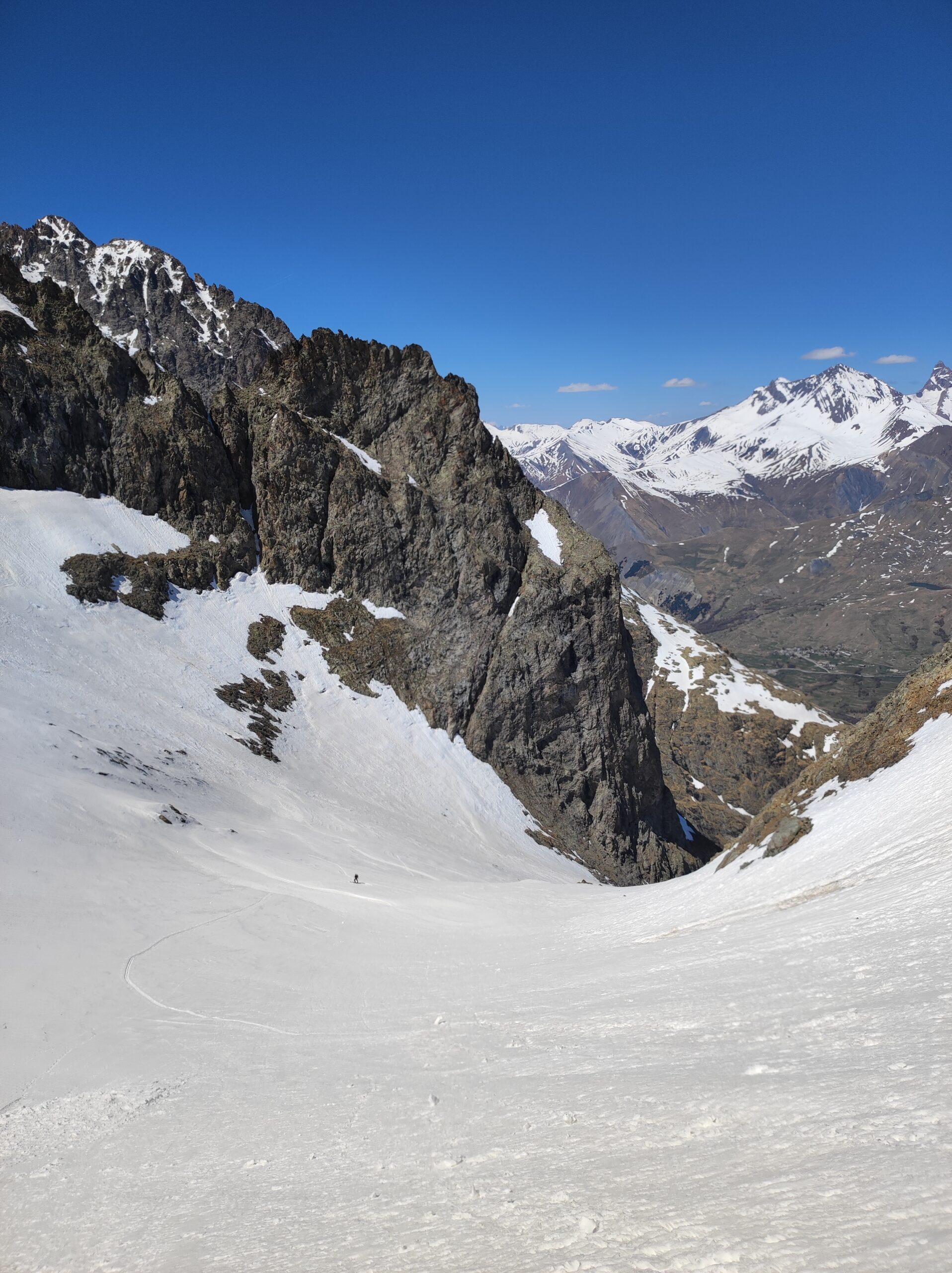 Mis à part un court passage en neige ventée restée très dure dans l’étroiture supérieure obligeant à un dérapage prudent, le reste de la descente s’effectue dans une neige juste dégelée superficiellement et bien skiante ; il eut finalement été possible de descendre un peu plus tard.