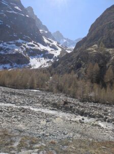 Nous remettons les skis sur le sac, et descendons le pierrier jusqu’à la rivière que nous retraversons, et rejoignons le bon chemin du vallon de la Romanche, d’où nous pouvons contempler le bas du vallon de l’Homme et la langue de neige que nous venons de skier :